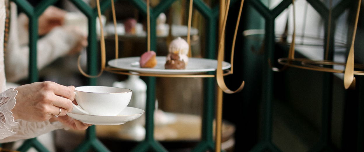 В Зелёной гостиной вы можете окунуться в атмосферу английского салона XIX века, дегустируя авторские десерты в клетках-этажерках. Вы можете выбрать один из двух вариантов чаепития: